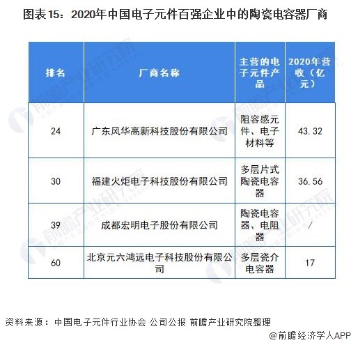2020年中國電子元件百強企業中,4家陶瓷電容器廠商入選,其中,廣東風華高新科技股份有限公司排名最前(24)