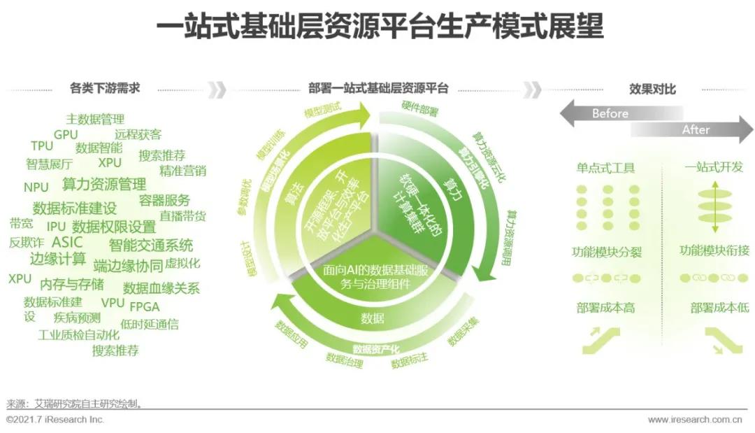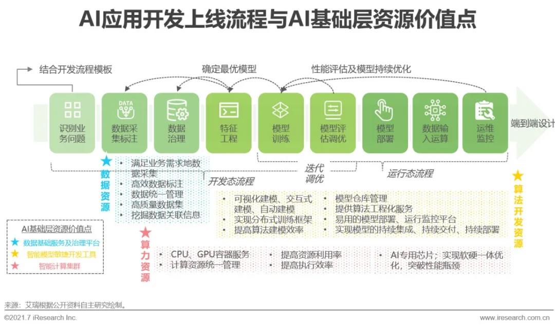 在人工智能由技術(shù)落地應(yīng)用階段向效率化生產(chǎn)階段轉(zhuǎn)變的背景下,艾瑞認為人工智能基礎(chǔ)層的各模塊工具有望走向集約型的生產(chǎn)模式。該模式主要能賦予開發(fā)企業(yè)以下價值:1)開發(fā)方式改進:從客戶需求分析到解決方案部署形成獨立的閉環(huán),構(gòu)建端到端的工作流。在強大算力的支持下,完成數(shù)據(jù)采集、數(shù)據(jù)標注、數(shù)據(jù)治理、數(shù)據(jù)應(yīng)用、模型設(shè)計、參數(shù)調(diào)優(yōu)、模型訓(xùn)練、模型測試、模型推理的全棧式流水線生產(chǎn)。2)管理效率提升:將數(shù)據(jù)、算法與算力委托給專業(yè)的服務(wù)商,實現(xiàn)一站式托管,打通三者之間的銜接壁壘,提高交互友好性,讓開發(fā)者專注于業(yè)務(wù)。3)部署成本降低:集成數(shù)據(jù)、算法、算力的各個軟件與硬件,企業(yè)可在一個平臺內(nèi)按需選擇自己所缺失的模塊組件并自由搭配,有效避免因采購不同供應(yīng)商的產(chǎn)品或服務(wù)而帶來的隱性成本損失與顯性成本損失。