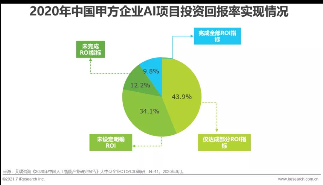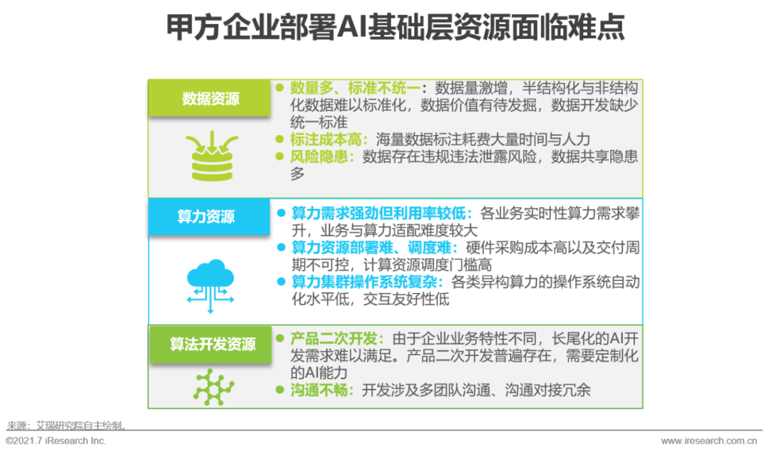 根據(jù)艾瑞2020年執(zhí)行的CTO調(diào)研,2019年超過51%的樣本企業(yè)AI相關(guān)研發(fā)費用占總研發(fā)費用比重在10%以上,202065.9%的企業(yè)AI研發(fā)占比達到10%以上。一方面是甲方企業(yè)不斷增長的對智能化轉(zhuǎn)型的強勁需求,一方面則是在AI應(yīng)用開發(fā)與部署過程中企業(yè)普遍面臨的數(shù)據(jù)質(zhì)量(49%)、技術(shù)人才(51%)等基礎(chǔ)資源配置難點。且目前只有少數(shù)企業(yè)可以完成AI項目實施前設(shè)定的全部投資回報率(ROI)標準,因此甲方企業(yè)在投資AI項目時相對審慎。AI基礎(chǔ)層資源則可有效緩解甲方利用AI技術(shù)重塑自身業(yè)務(wù)時的投資矛盾,提升模型生產(chǎn)效率,降低部署成本:數(shù)據(jù)資源集群具備數(shù)據(jù)采標與數(shù)據(jù)治理能力,且一站式的數(shù)據(jù)平臺可對實時數(shù)據(jù)進行統(tǒng)一管理,提高數(shù)據(jù)利用率;高效的AI算力集群與調(diào)度系統(tǒng)可滿足模型訓(xùn)練與推理需求,降低總擁有成本(TCOTotalCost of Ownership);基于算法開發(fā)平臺演化出的語音識別、計算機視覺、機器學(xué)習(xí)等專業(yè)的AI模型生產(chǎn)平臺,可提供高效、一站式的AI模型生產(chǎn)服務(wù)。