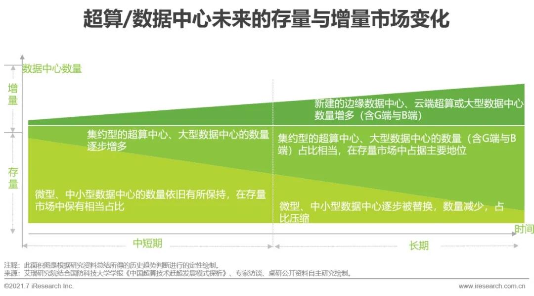 現(xiàn)有的超算/數(shù)據(jù)中心以建設(shè)單位為標準,可分為兩類:1)以國家或地方為建設(shè)單位的G端超算中心,服務(wù)對象主要為國家牽頭的重點科研單位、高校研究院等,此類超算中心是解決國家安全、科學(xué)進步、經(jīng)濟發(fā)展與國防建設(shè)等重大挑戰(zhàn)性問題的重要手段,近兩年受國家與地方的高度重視與扶持,建設(shè)與升級超算中心的趨勢愈加明朗。但由于數(shù)據(jù)網(wǎng)絡(luò)安全與計算精度要求高,建設(shè)周期較長,此類超算中心的數(shù)量在中短期內(nèi)增長緩慢,長期來看則會成為替換存量與增量增長的貢獻主力之一。2)以智能云廠商或IDC服務(wù)商為建設(shè)供應(yīng)主體的B端超算/數(shù)據(jù)中心,為互聯(lián)網(wǎng)公司、其他類型的企業(yè)或事業(yè)單位提供主機托管、資源出租、增值或應(yīng)用服務(wù),是存量與增量市場變化主要推力。