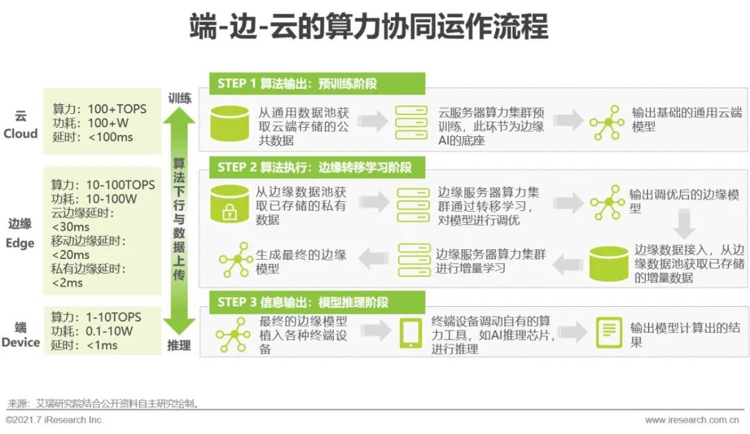 在人工智能與5G等技術(shù)的沖擊下,設(shè)備端產(chǎn)生大量實時數(shù)據(jù),若直接上傳到云端處理,會對云端的帶寬、算力、存儲空間等造成巨大壓力,同時也存在延時長、數(shù)據(jù)傳輸安全性等問題。因此,為緩解云端的工作負載,云計算在云與端之間新增了若干個邊緣計算節(jié)點,從而衍生出端--云的資源、數(shù)據(jù)與算力協(xié)同。在算力協(xié)同的業(yè)務(wù)模式下,靠近云端的云計算中心承擔(dān)更多的模型訓(xùn)練任務(wù),貼近端側(cè)的各設(shè)備主要進行模型推理,而二者之間的邊緣側(cè)則負責(zé)通用模型的轉(zhuǎn)移學(xué)習(xí),幫助云端分散通用模型訓(xùn)練任務(wù)、處理實時計算的同時,也解決了終端算力不足、計算功耗大的難題。未來,邊緣計算的發(fā)展會催生出更適宜邊緣計算場景的算力集群異構(gòu)設(shè)計,其異構(gòu)化程度將會高于傳統(tǒng)的數(shù)據(jù)中心,異構(gòu)設(shè)計的突破將會進一步提高端--云的整體計算效能,進而加速AI模型的訓(xùn)練與推理。