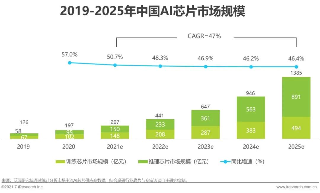 AI芯片是人工智能產(chǎn)業(yè)的關(guān)鍵硬件,也是AI加速服務(wù)器中用于AI訓(xùn)練與推理的核心計算硬件,被廣泛應(yīng)用于人工智能、云計算、數(shù)據(jù)中心、邊緣計算、移動終端等領(lǐng)域。當前,我國的AI芯片行業(yè)仍處于起步期,市場空間有待探索與開拓。據(jù)艾瑞統(tǒng)計與預(yù)測,2020年我國AI芯片市場規(guī)模為197億元,到2025年,我國AI芯片市場規(guī)模將達到1385億元,2021-2025年的相關(guān)CAGR=47%,市場整體增速較快。從AI芯片的計算功能來看,一開始,因AI應(yīng)用模型首先要在云端經(jīng)過訓(xùn)練、調(diào)優(yōu)與測試,計算的數(shù)據(jù)量與執(zhí)行的任務(wù)量數(shù)以萬計,故云端訓(xùn)練需求是AI芯片市場的主流需求。而在后期,訓(xùn)練好的AI應(yīng)用模型轉(zhuǎn)移到端側(cè),結(jié)合實時數(shù)據(jù)進行推理運算、釋放AI功能,推理需求逐漸取代訓(xùn)練需求,帶動推理芯片市場崛起。2025年,云端推理與端側(cè)推理成為市場規(guī)模增長的主要拉動力,提升了逐漸下滑的AI芯片市場規(guī)模同比增速。