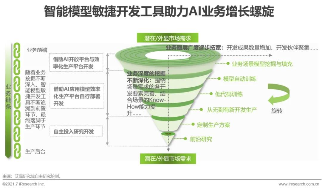 在人工智能產(chǎn)業(yè)發(fā)展的過程中,智能模型敏捷開發(fā)工具可持續(xù)拓寬與深挖AI業(yè)務(wù)的廣度和深度。從廣度講,AI開放平臺形成平臺效應(yīng),調(diào)用平臺API的開發(fā)者聚集創(chuàng)新,針對不同業(yè)務(wù)場景的開發(fā)成果數(shù)量逐漸增多,提高了技術(shù)產(chǎn)品的利用率,打造出輕量化的輸出模式、降低單位開發(fā)成本,并且構(gòu)建出動態(tài)更新的服務(wù)池;與此同時,一站式AI應(yīng)用模型效率化生產(chǎn)平臺逐步填充因場景多元化而衍生出的長尾業(yè)務(wù)模型,豐富模型供應(yīng)市場的種類與數(shù)量。從深度講,二者均從業(yè)務(wù)前端發(fā)掘潛在或外顯的市場需求,針對剛需應(yīng)用與高價值環(huán)節(jié)延伸出多條增量建設(shè)與運行需求業(yè)務(wù)線,瞄準市場風(fēng)口的同時,敏捷、經(jīng)濟地消化個性化或碎片化需求,根據(jù)需求柔性匹配生產(chǎn)。