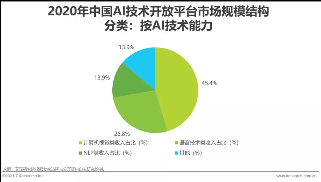 隨著數(shù)據(jù)量與AI算力的提升,可落地的場景與算法的交互變得愈加頻繁,二者結(jié)合開發(fā)出的AI應(yīng)用模型就需要更大量地通過API調(diào)用AI技術(shù)開放平臺的AI技術(shù)能力。據(jù)艾瑞統(tǒng)計與預(yù)測,2020年我國AI技術(shù)開放平臺市場規(guī)模為225億元,到2025年,相應(yīng)規(guī)模可達到730億元,2021-2025年的相關(guān)CAGR=26%。受API經(jīng)濟興起的影響,2020年市場規(guī)模同比增速走高較快,2021年下滑后恢復(fù)平穩(wěn)態(tài)勢。按AI技術(shù)能力劃分,計算機視覺類與語音技術(shù)類收入占比達72.2%,是收入的主要貢獻來源。人臉識別、人體識別、OCR文字識別、圖像識別等構(gòu)成了計算機視覺類業(yè)務(wù)的主要技術(shù)能力,且計算機視覺類的技術(shù)價格相較于其他技術(shù)而言更高,應(yīng)用領(lǐng)域也更為廣泛。現(xiàn)階段的市場集中度相對分散,未來,能持續(xù)投入成本、研發(fā)出強勁算法的廠商有望占領(lǐng)更多的市場份額,市場集中度亦會因此提升。