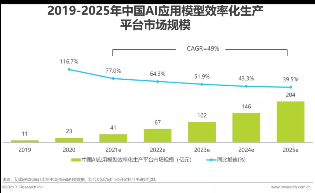 AI應(yīng)用模型效率化生產(chǎn)平臺是全棧式的、可實現(xiàn)流水線開發(fā)的AI應(yīng)用模型生產(chǎn)工具。假若每次開發(fā)模型都需要算法工程師單獨完成從生產(chǎn)到上線的全流程搭建,就會導(dǎo)致很多時間的耗損與AI模型開發(fā)成本的浪費。集成了數(shù)據(jù)、算法與算力的相應(yīng)開發(fā)工具的模型開發(fā)工具包——AI應(yīng)用模型效率化生產(chǎn)平臺應(yīng)運而生。據(jù)艾瑞統(tǒng)計與預(yù)測,2020年我國AI應(yīng)用模型效率化生產(chǎn)平臺市場規(guī)模為23億元;到2025年,相應(yīng)規(guī)模可達到204億元,2021-2025年的相關(guān)CAGR=49%2020年,AI應(yīng)用模型效率化生產(chǎn)平臺相關(guān)業(yè)務(wù)拓展相對較快、產(chǎn)品恰逢創(chuàng)收伊始階段,故同比增速增幅較快。與此同時,因參與技術(shù)門檻偏高,具備能力的廠商較少,市場尚未形成穩(wěn)定狀態(tài),市場集中度偏高。