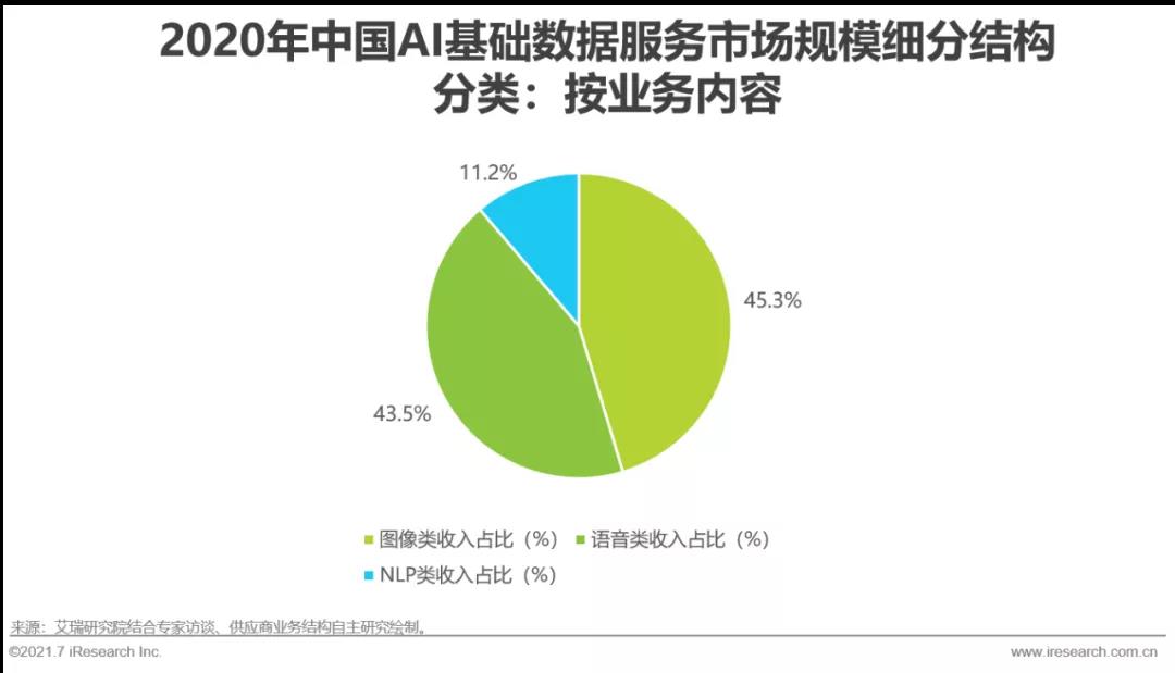 高質(zhì)量的數(shù)據(jù)是提高AI應(yīng)用模型訓(xùn)練速度與精度的必要準備之一,而行之有效的AI基礎(chǔ)數(shù)據(jù)服務(wù)又為提高數(shù)據(jù)質(zhì)量奠定了堅實的基礎(chǔ)。因而,提供通用化、精細化、場景化的AI基礎(chǔ)數(shù)據(jù)服務(wù)才能滿足日漸增長的AI應(yīng)用模型訓(xùn)練需求。據(jù)艾瑞統(tǒng)計與預(yù)測,2020年我國AI基礎(chǔ)數(shù)據(jù)服務(wù)市場規(guī)模(含數(shù)據(jù)采集與標注)為37億元,到2025年,相應(yīng)規(guī)模可達到107億元,2021-2025年的相關(guān)CAGR=25%,整體增速呈現(xiàn)穩(wěn)步提升的趨勢。從市場細分收入結(jié)構(gòu)來看,圖像類與語音類收入占總收入規(guī)模的88.8%,是業(yè)務(wù)的主要構(gòu)成部分;圖像類與語音類收入基本持平,圖像類業(yè)務(wù)以智能駕駛與安防為主,而語音類業(yè)務(wù)以中英大語種、中國本土方言以及外國小語種為主。目前,行業(yè)中也相應(yīng)地分成了以圖像類或語音類為主的供應(yīng)商陣營,各類供應(yīng)商將會繼續(xù)立足于主營業(yè)務(wù),深挖現(xiàn)有應(yīng)用場景的業(yè)務(wù)細分需求,從而帶動未來收入的增長。