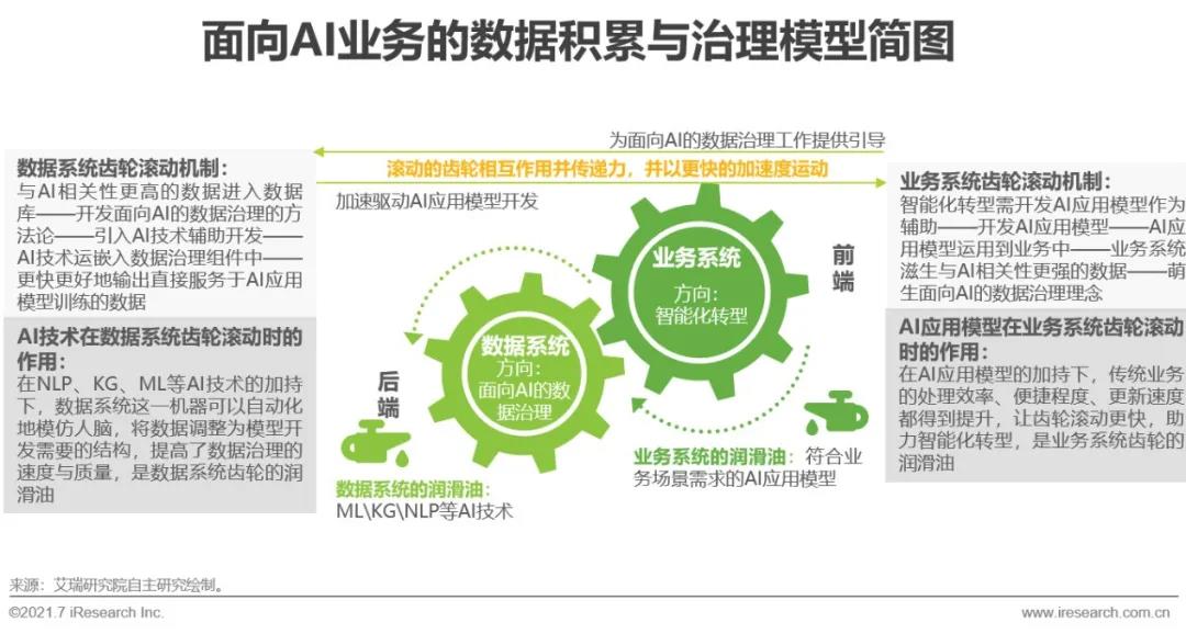在大數(shù)據(jù)應(yīng)用的驅(qū)動下,具有相當數(shù)據(jù)規(guī)模的企業(yè)的多條業(yè)務(wù)條線往往會產(chǎn)生大量的結(jié)構(gòu)化與非結(jié)構(gòu)化數(shù)據(jù),愈加需要企業(yè)內(nèi)部的數(shù)據(jù)及時融通,但企業(yè)不可能完全拋棄現(xiàn)有的數(shù)據(jù)庫系統(tǒng)、更換一套完全符合面向AI業(yè)務(wù)開發(fā)的數(shù)據(jù)治理系統(tǒng);另一方面,智能化轉(zhuǎn)型浪潮推動著企業(yè)的AI應(yīng)用開發(fā)需求增長,但數(shù)據(jù)開發(fā)缺少統(tǒng)一標準、數(shù)據(jù)與業(yè)務(wù)場景割裂,讓面向AI的數(shù)據(jù)治理的工作面臨兩難的局面。對此,艾瑞認為面向AI的數(shù)據(jù)治理并非完全舍棄已有的數(shù)據(jù)治理結(jié)構(gòu),而是在原有的基礎(chǔ)上,進行數(shù)據(jù)治理結(jié)構(gòu)的改造,讓治理工作更多為AI開發(fā)服務(wù),從而完成AI業(yè)務(wù)數(shù)據(jù)的積累。面向AI的數(shù)據(jù)治理工作完成后,才能驅(qū)動AI應(yīng)用模型開發(fā)高效、高質(zhì)運行,而模型開發(fā)反過來會為面向AI的數(shù)據(jù)治理工作提供指導(dǎo)。業(yè)務(wù)系統(tǒng)與數(shù)據(jù)系統(tǒng)像兩個錨準工作方向的齒輪,共同滾動。符合業(yè)務(wù)場景需求的AI應(yīng)用模型、ML\KG\NLPAI技術(shù)加速促進兩個齒輪的轉(zhuǎn)動,使企業(yè)的業(yè)務(wù)系統(tǒng)運轉(zhuǎn)效率向高質(zhì)高效發(fā)展,為企業(yè)帶來更可觀的智能化轉(zhuǎn)型業(yè)務(wù)發(fā)展速度與業(yè)務(wù)服務(wù)質(zhì)量。