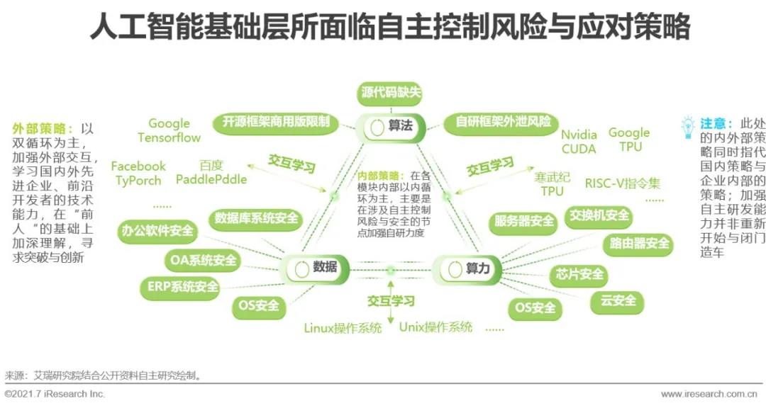 信創(chuàng)產(chǎn)業(yè)涉及到核心技術(shù)問題,受到國家的大力扶持。比如,202012月,財政部、發(fā)改委、工信部等部門就聯(lián)合發(fā)布了《關(guān)于促進集成電路產(chǎn)業(yè)和軟件產(chǎn)業(yè)高質(zhì)量發(fā)展企業(yè)所得稅政策的公告》,文中明確指出:國家鼓勵的集成電路線寬小于130納米(),且經(jīng)營期在10年以上的集成電路生產(chǎn)企業(yè)或項目,第一年至第二年免征企業(yè)所得稅,可見國家對國產(chǎn)芯片的重視。在信創(chuàng)產(chǎn)業(yè)穩(wěn)步推廣的的趨勢下,人工智能基礎(chǔ)層的各模塊也在逐個突破“卡脖子”的關(guān)鍵點,朝著全棧國產(chǎn)化的方向邁進。算法模塊相對其他兩個模塊而言,因開源框架協(xié)助,算法開發(fā)相對容易,但依然面臨開源框架商用版限制的潛在風(fēng)險,同時,使用開源框架難以友好對接到AI企業(yè)的業(yè)務(wù)邏輯,基于這兩點,部分企業(yè)已開始自研開源框架并取得一定成效;數(shù)據(jù)模塊的各類操作系統(tǒng)與應(yīng)用軟件在較大程度上仍以國外企業(yè)為主導(dǎo),而國產(chǎn)的操作系統(tǒng)與數(shù)據(jù)庫等軟件配套設(shè)施正在穩(wěn)步崛起,已存在相應(yīng)的產(chǎn)品與服務(wù)可供客戶選擇;算力模塊的智能服務(wù)器的國產(chǎn)化率逐步提升,AI芯片雖然仍以英偉達的GPU為主導(dǎo),但國內(nèi)部分企業(yè)開始自研AI芯片,產(chǎn)生了一批針對通用GPUASICFPGA的先行玩家。總的來說,基礎(chǔ)層全棧的自主可控建設(shè)還處在萌芽階段,未來將在“可用”的建設(shè)要求上打好根基,向“好用”的狀態(tài)演變,并且從以政府政策引導(dǎo)為主的局面向以企業(yè)產(chǎn)品自由競爭的局面轉(zhuǎn)變。