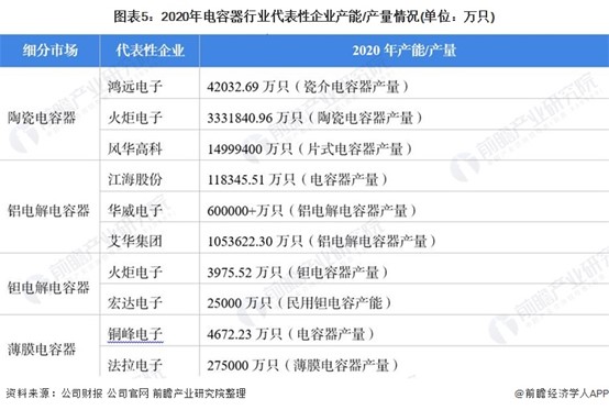 目前,布局了電容器業務的企業中,廣東風華高新科技股份有限公司在電容器產量上遙遙領先于其它企業。電容器行業產業鏈上的其它代表性企業產能/產量情況如下: