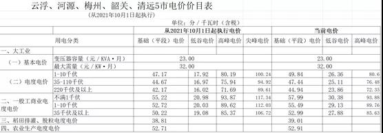 五、云浮、河源、梅州、韶關、清遠(不含連州)等5市電價變化情況