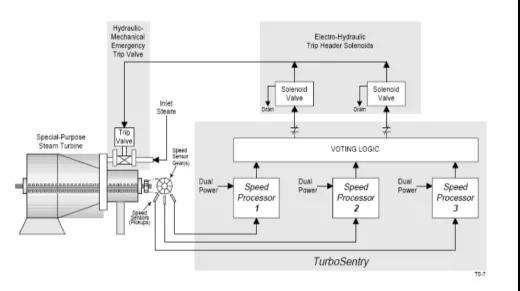 按照API標(biāo)準(zhǔn),整個(gè)機(jī)組配置有獨(dú)立的三取二超速保護(hù)器對(duì)機(jī)組實(shí)行超速保護(hù)。