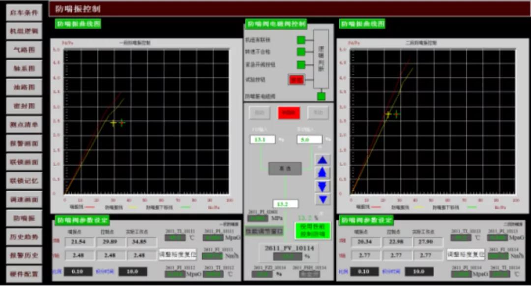在機(jī)組啟動(dòng)和停機(jī)過程中,由于機(jī)組流量過低,如果沒有防喘振控制,就會(huì)因喘振的發(fā)生對(duì)機(jī)組造成損壞。