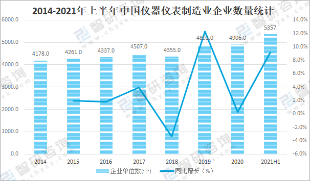 儀器儀表應用領域廣泛,覆蓋了工業、農業、交通、科技、環保、國防、文教衛生、人民生活等各方面,在國民經濟建設各行各業的運行過程中承擔著把關者和指導者的任務。由于其地位特殊、作用大,對國民經濟有巨大倍增和拉動作用,有著良好的市場需求和巨大的發展潛力。總體來看,中國儀器儀表制造業企業數量呈增長趨勢,2020年中國儀器儀表制造業企業數量達4906個,較2019年增加了14個,同比增長0.3%,截止2021年6月中國儀器儀表制造業企業數量達5357個。