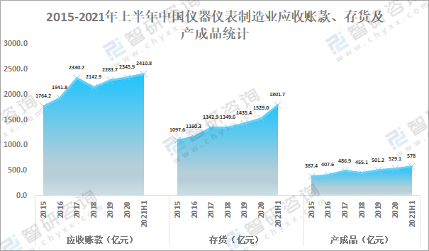2015-2021年上半年中國儀器儀表制造業應收賬款、存貨及產成品統計