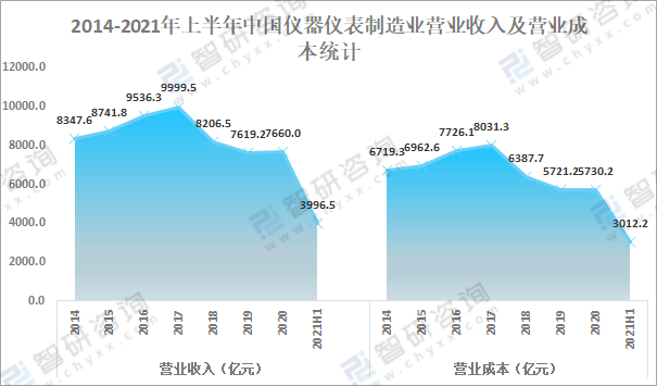 2014-2021年上半年中國儀器儀表制造業營業收入及營業成本統計