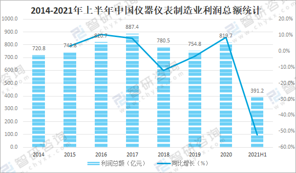 隨著中國儀器儀表制造業營業收入的增加,利潤總額也隨之增長,2020年中國儀器儀表制造業利潤總額達819.7億元,較2019年增加了64.94億元,同比增長8.6%,2021年上半年中國儀器儀表制造業利潤總額已完成391.2億元。
