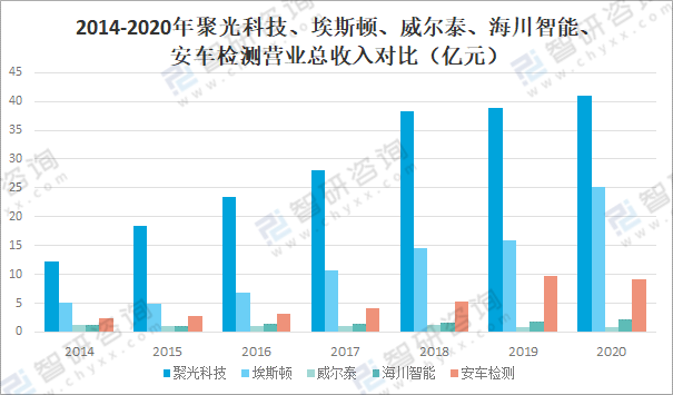 2014-2020年聚光科技、埃斯頓、威爾泰、海川智能、安車檢測營業總收入對比(億元)