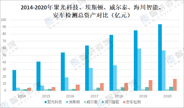 2014-2020年聚光科技、埃斯頓、威爾泰、海川智能、安車檢測總資產對比(億元)
