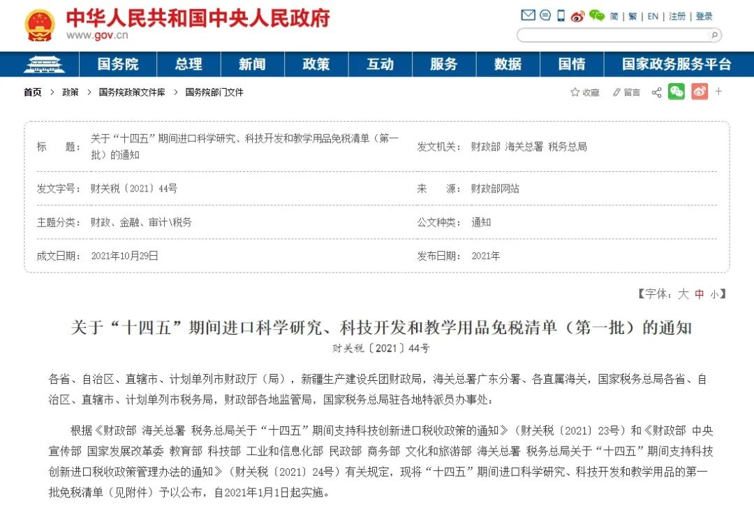 《財政部 海關總署 稅務總局關于“十四五”期間進口科學研究、科技開發和教學用品免稅清單(第一批)的通知》(財關稅〔2021〕44 號)發布。