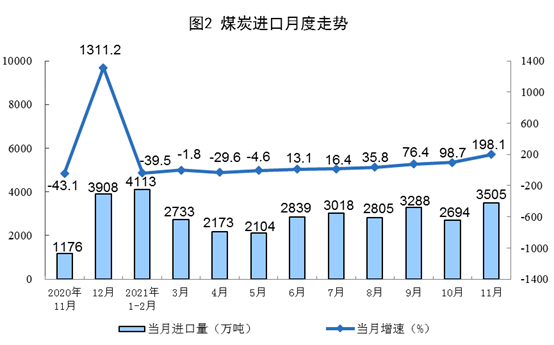 原煤生產有所加快。隨著增產保供政策持續推進,11月份,生產原煤3.7億噸,同比增長4.6%,增速比上月加快0.6個百分點,比2019年同期增長6.1%,兩年平均增長3.0%,日均產量1236萬噸。進口煤炭3505萬噸,同比增長198.1%。