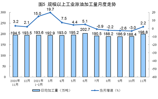 1—11月份,生產原油18248萬噸,同比增長2.5%,比2019年同期增長4.2%,兩年平均增長2.1%;加工原油64479萬噸,同比增長4.9%,比2019年同期增長8.2%,兩年平均增長4.0%。