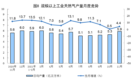 天然氣生產加快。11月份,生產天然氣177億立方米,同比增長4.4%,增速比上月加快3.9個百分點,比2019年同期增長16.7%,兩年平均增長8.0%,日均產量5.9億立方米。
