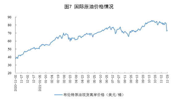 原油進口降幅收窄,國際原油價格下跌。11月份,進口原油4179萬噸,同比下降7.9%,降幅比上月收窄3.1個百分點;1—11月份,進口原油46684萬噸,同比下降7.3%。11月29日,布倫特原油現貨離岸價格為73.3美元/桶,比10月29日下跌11.7%。