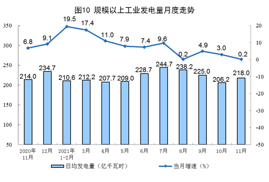 電力生產增速繼續回落。11月份,發電6540億千瓦時,同比增長0.2%,增速比上月回落2.8個百分點,比2019年同期增長7.0%,兩年平均增長3.5%,日均發電218億千瓦時。1—11月份,發電73827億千瓦時,同比增長9.2%,比2019年同期增長11.3%,兩年平均增長5.5%。