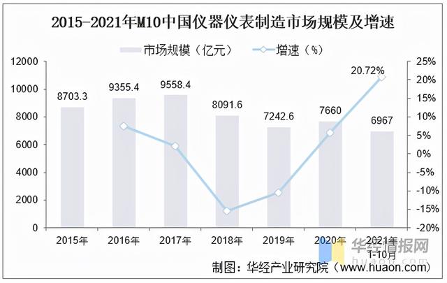 2015-2021年M10中國儀器儀表制造市場規(guī)模及增速