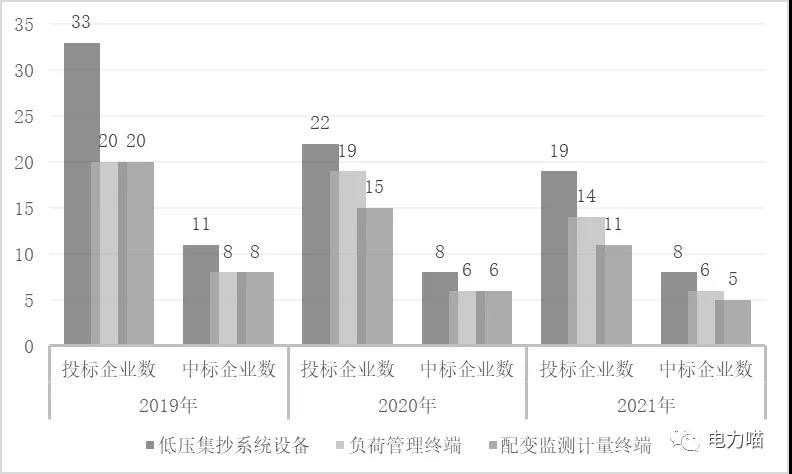 在低壓集抄系統設備市場,近三年共有33家企業參與競爭,共有13家企業有中標記錄。在負荷管理終端市場,近三年共有20家企業參與競爭,共有9家企業有中標記錄。在配變監測計量終端市場,近三年共有20家企業參與競爭,共有8家企業有中標記錄。