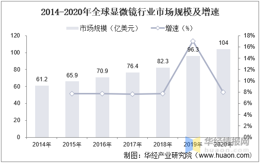 2020年受疫情沖擊,全球教學和科研等領域對顯微鏡的采購需求延后,導致2020年上半年教學及工業類顯微鏡市場出現明顯下降。隨著疫情逐漸得到控制,市場需求也在逐步恢復。據統計,2020年全球顯微鏡市場規模達到104億美元,同比上漲8%。同時,隨著后疫情時代全球對生命科學的重視程度增加,相應的科研采購需求將推動行業進一步增長。