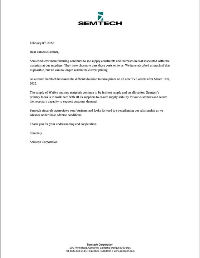 升特公司在通知中表示,由于供應(yīng)商原材料價(jià)格不斷上漲,半導(dǎo)體制造產(chǎn)能仍舊短缺并且成本還在增加,供應(yīng)商不得不把部分成本轉(zhuǎn)移到升特公司身上。公司已經(jīng)吸收了很大的成本,但目前已無(wú)法再吸收更多。