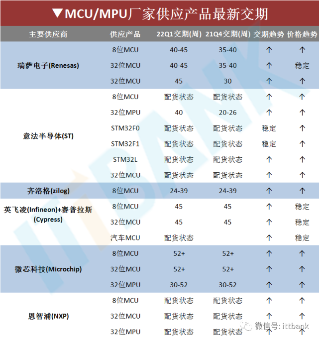 此外,英飛凌的汽車(chē)MCU交期也繼續(xù)拉長(zhǎng),今年第一季度的交期為配貨狀態(tài);模擬芯片的交期最長(zhǎng)為52周以上,最短也要18周,其中汽車(chē)模擬芯片45-52周。有媒體表示,英飛凌的這一通知函或?qū)⒁l(fā)芯片市場(chǎng)的新一輪漲價(jià)潮。