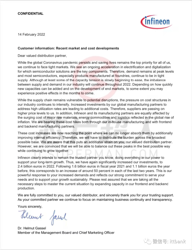 近期媒體報(bào)道,一則英飛凌的通知函送達(dá)到下游各分銷(xiāo)合作伙伴手中:由于市場(chǎng)供不應(yīng)求及上游成本的增加,英飛凌無(wú)力承擔(dān)溢出的成本,暗示或?qū)q價(jià)。