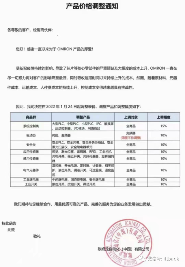 受疫情影響,零部件短缺及成本大幅提升等原因,歐姆龍產(chǎn)品提價(jià)10%-15%。