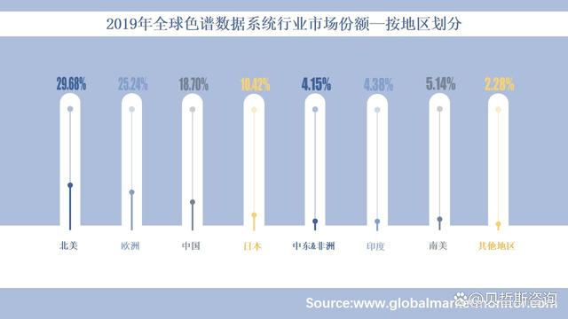 北美是全球色譜數據系統行業最大的營收市場,2019年,該地區占據全球29.68%的市場份額,市場總值為98.91百萬美元;歐洲以25.25%的市場份額排名第二;其次,亞洲的兩大經濟體--中國和日本分別以18.70%和10.42%的份額位居全球色譜數據系統行業的第三、第四位;南美市場占比5.14%;而中東和非洲以及印度等地區的比重較低,都在5%以下。