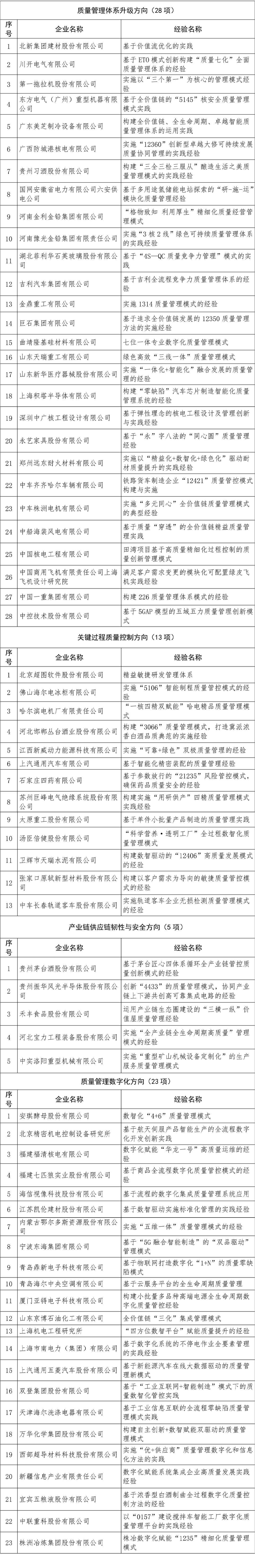 2023年全國質量標桿名單
