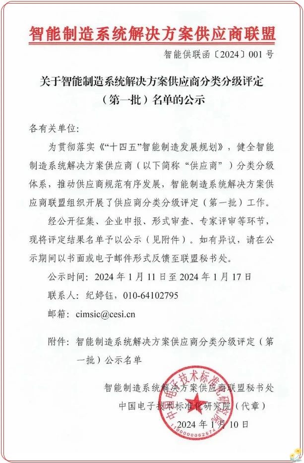 近日,智能制造系統解決方案供應商分類分級評定(第一批)名單進行公示,和利時入選集成實施AAA級企業,公示名單如下: