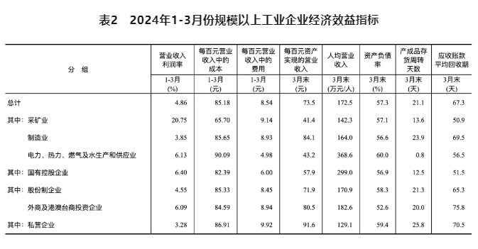 3月末,規模以上工業企業每百元資產實現的營業收入為73.5元,同比減少2.9元;人均營業收入為172.5萬元,同比增加7.5萬元;產成品存貨周轉天數為21.1天,同比持平;應收賬款平均回收期為67.3天,同比增加3.8天。