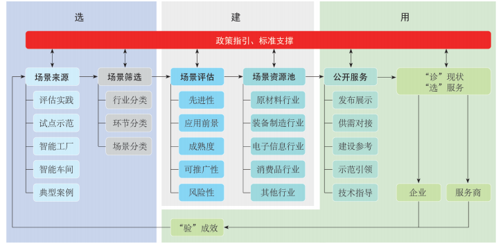 數字化場景資源池建設的關鍵是對外服務,以示范、參考、指導等方式助力企業數字化場景建設。可以通過平臺的方式公開發布優秀場景案例、場景提供方名錄、技術邏輯方案等信息,為轉型企業和服務商打造精準高效的資源獲取和服務對接平臺。有轉型需求的企業可以通過信息發現、場景對比分析,“診”自身場景數字化現狀,快速錨準具體轉型場景,明確轉型方案和目標,同時“選”優秀場景案例指導自身場景數字化建設。服務商可以通過場景對標分析,“診”自身數字化場景方案的成熟度和能力,“選”與自身同方向的優秀場景指導方案優化,持續提升服務能力。企業和服務商的成功實踐通過“驗”之后,將不斷轉化為資源池的場景來源,形成“選”“建”“用”的良性閉環,不斷豐富資源池場景。