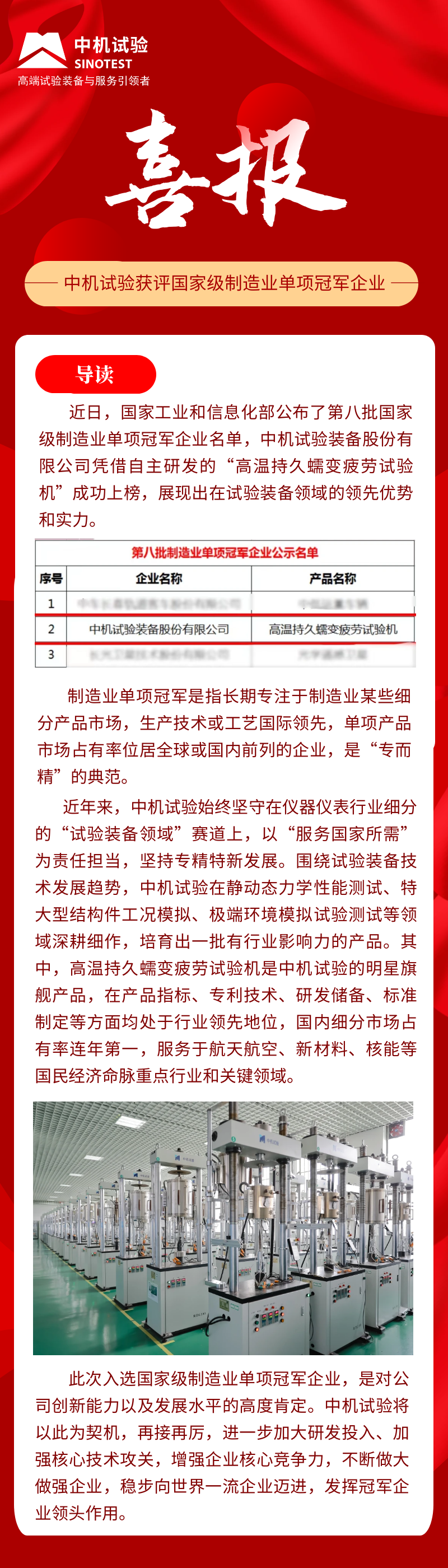 中機(jī)試驗(yàn)獲評(píng)國(guó)家級(jí)制造業(yè)單項(xiàng)冠軍企業(yè)