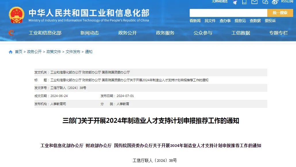工業和信息化部辦公廳 財政部辦公廳 國務院國資委辦公廳關于開展2024年制造業人才支持計劃申報推薦工作的通知