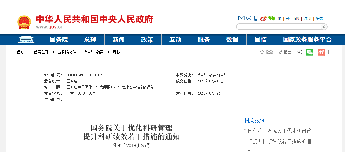 國務(wù)院關(guān)于優(yōu)化科研管理提升科研績效若干措施的通知