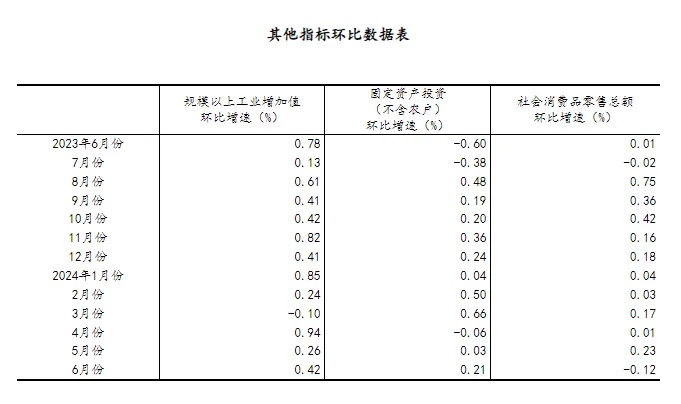 2)根據季節調整模型自動修正結果,對近一年來各期國內生產總值、規模以上工業增加值、固定資產投資(不含農戶)、社會消費品零售總額環比增速進行修訂。修訂結果及2024年二季度GDP環比數據、20246月份其他指標環比數據如下: