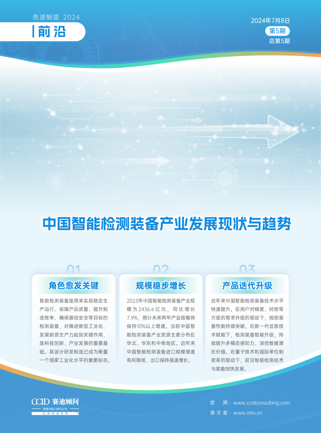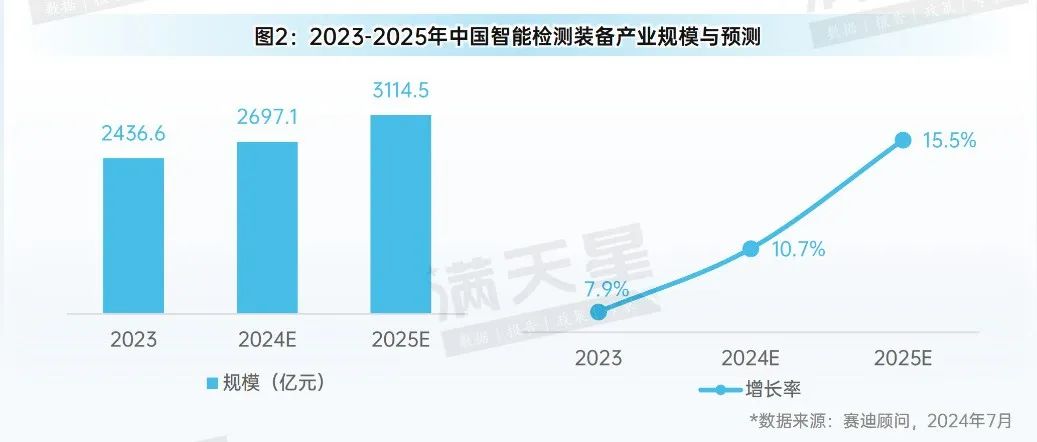 2023年中國智能檢測裝備產(chǎn)業(yè)規(guī)模為2436.6億元,較上年增長7.9%。受國家推進新型工業(yè)化、發(fā)展新質(zhì)生產(chǎn)力、加快工業(yè)設(shè)備更新等利好政策影響,預(yù)計未來幾年將持續(xù)保持10%以上的增速,2025年整體產(chǎn)業(yè)規(guī)模將突破3000億元。隨著智能制造深入推進,智能檢測裝備需求日益增加,新技術(shù)新產(chǎn)品競相涌現(xiàn),產(chǎn)業(yè)呈現(xiàn)快速發(fā)展勢頭??傮w來看中國智能檢測裝備產(chǎn)業(yè)仍存在技術(shù)基礎(chǔ)薄弱、創(chuàng)新能力不強、高端供給不足、產(chǎn)業(yè)體系不完善和應(yīng)用生態(tài)不健全等問題,已成為智能制造深入發(fā)展的關(guān)鍵短板和重要制約。黨的二十屆三中全會公報指出,高質(zhì)量發(fā)展是全面建設(shè)社會主義現(xiàn)代化國家的首要任務(wù)。推進智能檢測裝備發(fā)展是產(chǎn)業(yè)基礎(chǔ)高級化的重要領(lǐng)域,對推進產(chǎn)業(yè)實現(xiàn)歷史性變革、系統(tǒng)性重塑、整體性重構(gòu)具有重要價值。工信部等部門出臺的《智能檢測裝備產(chǎn)業(yè)發(fā)展行動計劃(2023-2025年)》等一系列政策,提出了“到2025年,智能檢測技術(shù)基本滿足用戶領(lǐng)域制造工藝需求,核心零部件、專用軟件和整機裝備供給能力顯著提升,重點領(lǐng)域智能檢測裝備示范帶動和規(guī)模應(yīng)用成效明顯,產(chǎn)業(yè)生態(tài)初步形成“等發(fā)展目標(biāo)。