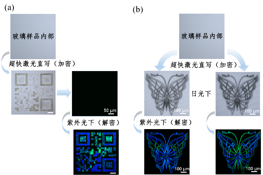 利用超快激光直寫(xiě)的方法可以在在同一片玻璃內(nèi)部三維直寫(xiě)發(fā)光波長(zhǎng)組合可調(diào)的納米晶圖案,該技術(shù)可以用于創(chuàng)建快速響應(yīng)的二維碼,直寫(xiě)帶有加密信息的數(shù)據(jù)圖案,如圖6(a)所示。基于納米晶發(fā)光波長(zhǎng)的可調(diào)節(jié)性,在圖案的不同區(qū)域可以指定其發(fā)光色彩(例如藍(lán)色和綠色),且這種顏色分布差異在日光下并不可見(jiàn),只能在紫外光照射下觀察到。如圖6(b)所示,在日光下直寫(xiě)的“蝴蝶”圖案沒(méi)有顯著差異,但在紫外光下圖案在不同區(qū)域呈現(xiàn)不同顏色。與其它基于鈣鈦礦納米晶的加密標(biāo)簽相比,玻璃中直寫(xiě)的納米晶具有顯著的光穩(wěn)定性和熱穩(wěn)定性,更加適用于關(guān)鍵信息的加密和解密。