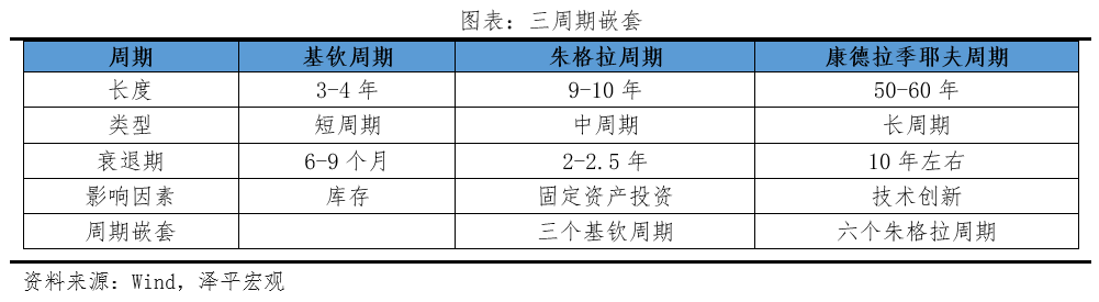 超長(zhǎng)波的創(chuàng)新周期(又稱康德拉耶夫周期)是由創(chuàng)新活動(dòng)的集聚發(fā)生所致,50-70年左右;瑞·達(dá)利奧提出的超長(zhǎng)波的債務(wù)周期是居民借貸調(diào)整而引導(dǎo)的經(jīng)濟(jì)周期,50-75年左右;長(zhǎng)波的房地產(chǎn)周期(又稱庫(kù)茲涅茨周期)主要是住房建設(shè)活動(dòng)導(dǎo)致的,20-40年左右;中長(zhǎng)波的設(shè)備投資/產(chǎn)能周期(又稱朱格拉周期)揭示的是產(chǎn)業(yè)在生產(chǎn)設(shè)備和基礎(chǔ)設(shè)施的循環(huán)投資活動(dòng),6-11年左右;中短波的庫(kù)存周期(又稱基欽周期)揭示的是工商業(yè)部門的存貨調(diào)整周期,3-4年左右。
