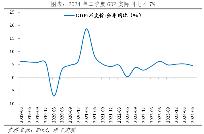 經(jīng)濟(jì)總體上生產(chǎn)強(qiáng)于消費(fèi),供過于求導(dǎo)致物價(jià)低迷,名義GDP增速弱于實(shí)際。二季度經(jīng)濟(jì)放緩,GDP環(huán)比弱于一季度,二三產(chǎn)業(yè)增速下滑。二季度GDP實(shí)際同比4.7%,較一季度下滑0.6個(gè)百分點(diǎn)。2024年上半年名義GDP增速為4.0%,實(shí)際為5.0%GDP平減指數(shù)同比初步核算為-0.9%;第二產(chǎn)業(yè)累計(jì)同比為5.8%,第三產(chǎn)業(yè)為4.6%