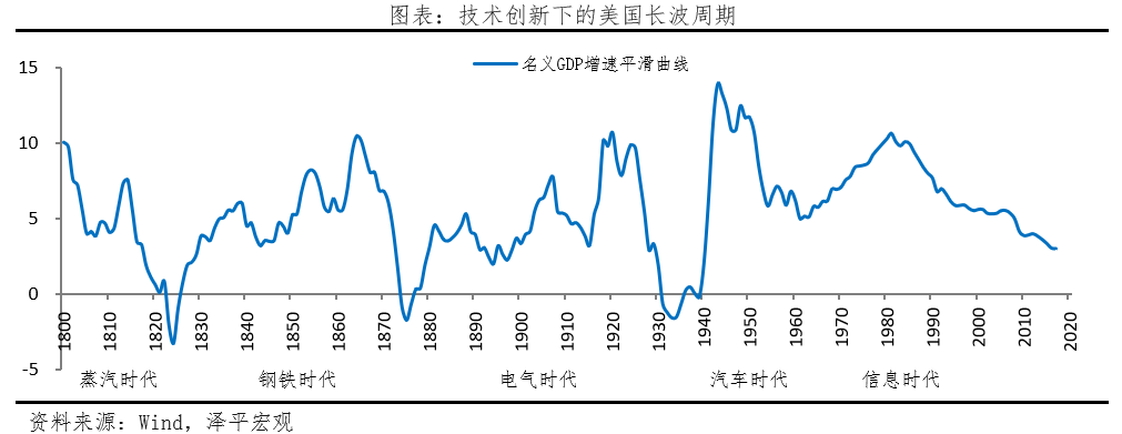 從康波周期來看,世界經(jīng)濟(jì)當(dāng)前正處在信息技術(shù)主導(dǎo)的第五輪周期末期和AI主導(dǎo)的第6輪周期的起步階段。前五次創(chuàng)新周期的主導(dǎo)創(chuàng)新技術(shù)分別為:紡織工業(yè)和蒸汽機(jī)技術(shù)(63年),鋼鐵和鐵路技術(shù)(47年),電氣和重化工業(yè)(56年),汽車和電子計(jì)算機(jī)(43年),信息技術(shù)(34年)。隨著科技迭代速度加快,創(chuàng)新周期的持續(xù)時(shí)長(zhǎng)也在逐步縮短。上世紀(jì)90年代以來,信息技術(shù)的創(chuàng)新推動(dòng)了第五次創(chuàng)新周期的繁榮。當(dāng)技術(shù)創(chuàng)新影響力逐漸衰退,高價(jià)格得不到盈利支持時(shí),互聯(lián)網(wǎng)泡沫破滅,2008年次貸危機(jī)標(biāo)志著本輪創(chuàng)新周期繁榮期結(jié)束、衰退期開始。而2020年以來,以無人駕駛、人工智能、物聯(lián)網(wǎng)、區(qū)塊鏈等為首的數(shù)字化革命標(biāo)志著第六輪創(chuàng)新周期正在起步。
