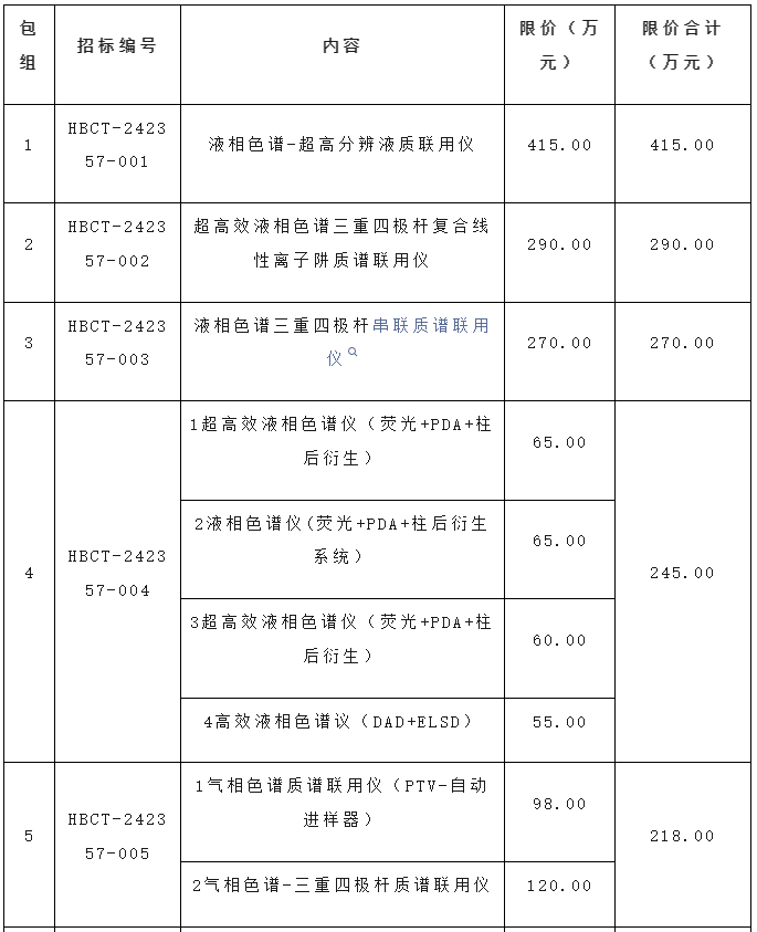 111日,中國政府采購網發布了石家莊海關技術中心2024年實驗室儀器設備更新項目公開招標公告,項目預算金額2397萬元,采購液相色譜-超高分辨液質聯用儀、高效液相色譜議、氣相色譜-三重四極桿質譜聯用儀、原子吸收分光光度計等儀器設備。